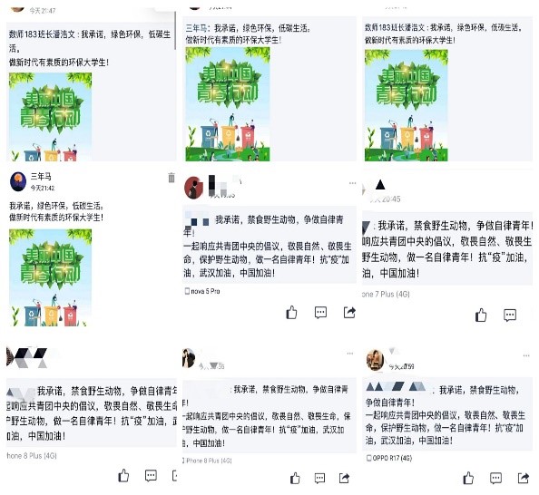 “绿水青山就是金山银山,我们是大自然的一分子,守护家园是我们共同的责任,努力构建人与自然和谐共生的生命共同体,人人有责。”乡村定向师范班班长潘浩文在“同上一堂疫情防控思政大课”的观后感中这样写道,“我带头发起‘禁食野生动物,争做自律青年’线上‘云’倡议,从一到十,从十到百……越来越多的志愿者加入我们,守护我们共同的家园。”