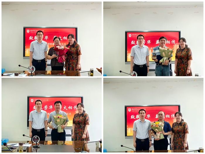 接玉芹表示,学院的一砖一瓦里都蕴藏着四位荣休教师的汗水,学校的一草一木都浸润着他们浓浓的教育情怀和高尚风范。期望荣休教师继续关心支持学院的发展,为学院在人才培养、科学研究、青年教师成长等方面积极建言献策。学院的青年教师要以前辈为榜样,紧握接力棒,不负所托奉献韶华,薪火相传,弦歌不辍。